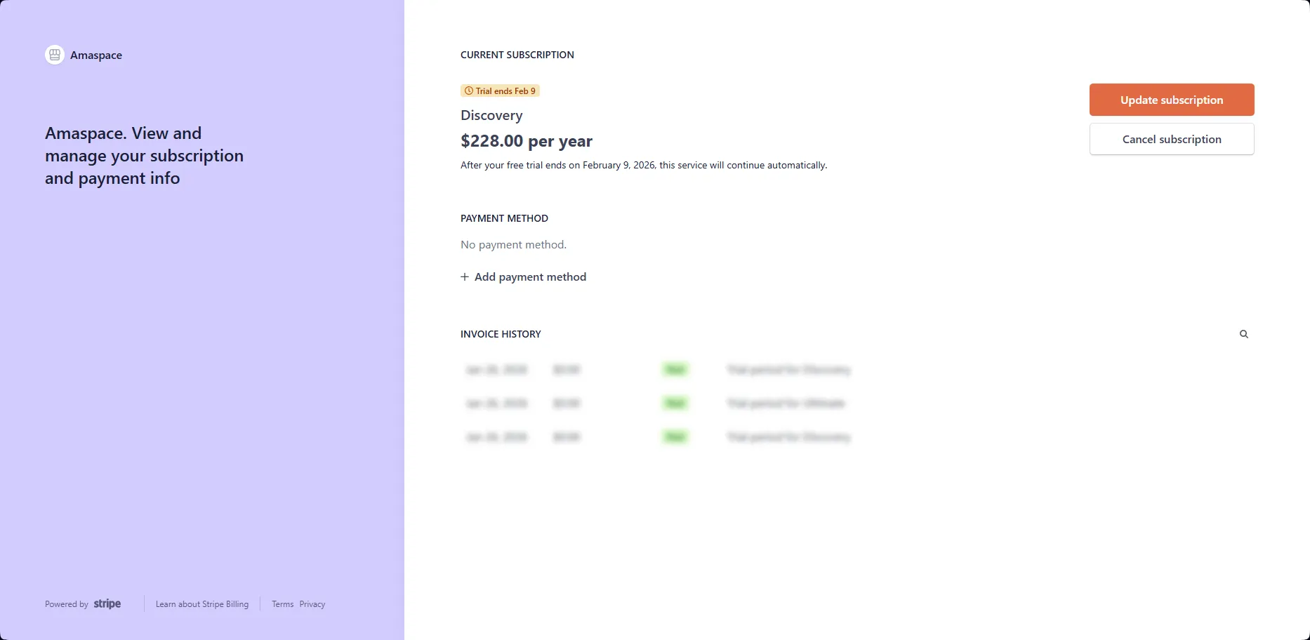 Subscription page: https://app.amaspace.co/profile?tab=subscription