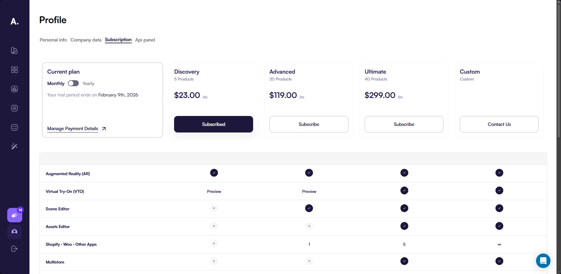 This article explains how to manage your Amaspace subscription, including plan options, billing cycles, trial periods, payment methods, and API access through the subscription and API panel tabs in your profile settings