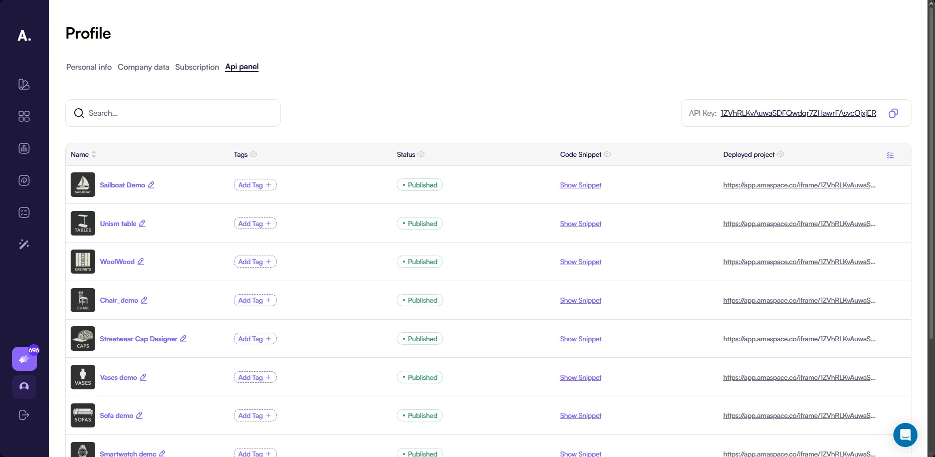 This article also covers the API panel, where you find your public API key and view published products. The API key is required to generate configurator links and integrate Amaspace into external platforms.
