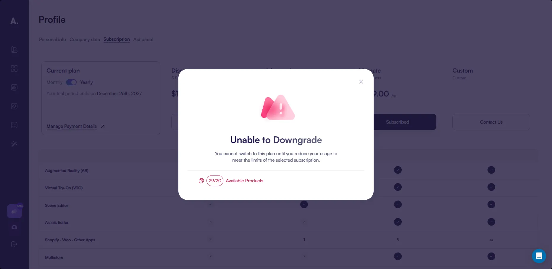 When you downgrade a plan through the Amaspace admin panel, the system checks your current usage against the new plan limits.