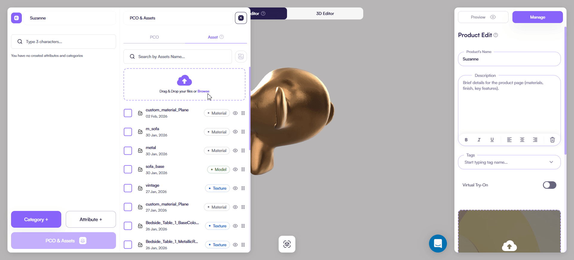 Uploading assets is the first step to making your product configurable in Amaspace. Assets include 3D models, textures, and materials (materials are created inside Amaspace and can reference uploaded textures).