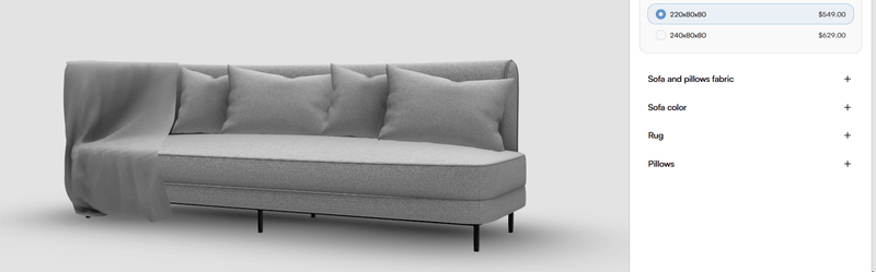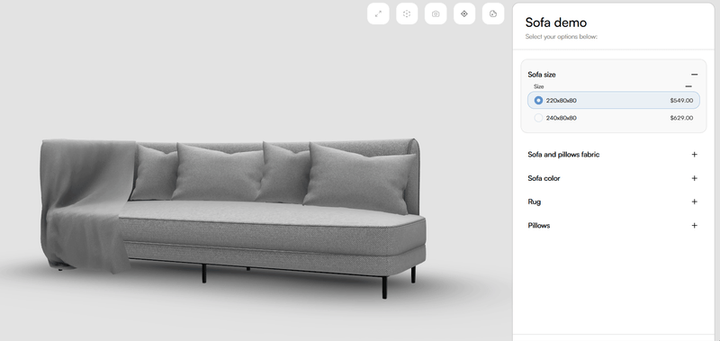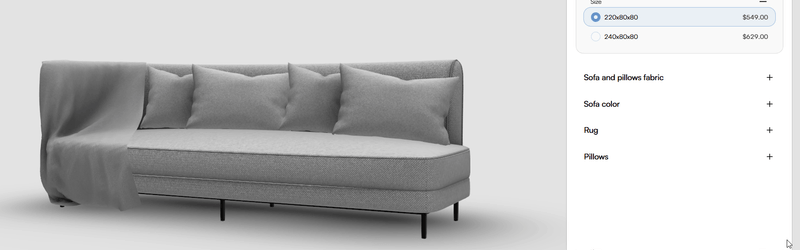 You define a set of visual options, and each selection updates materials in the 3D scene and recalculates the product price.