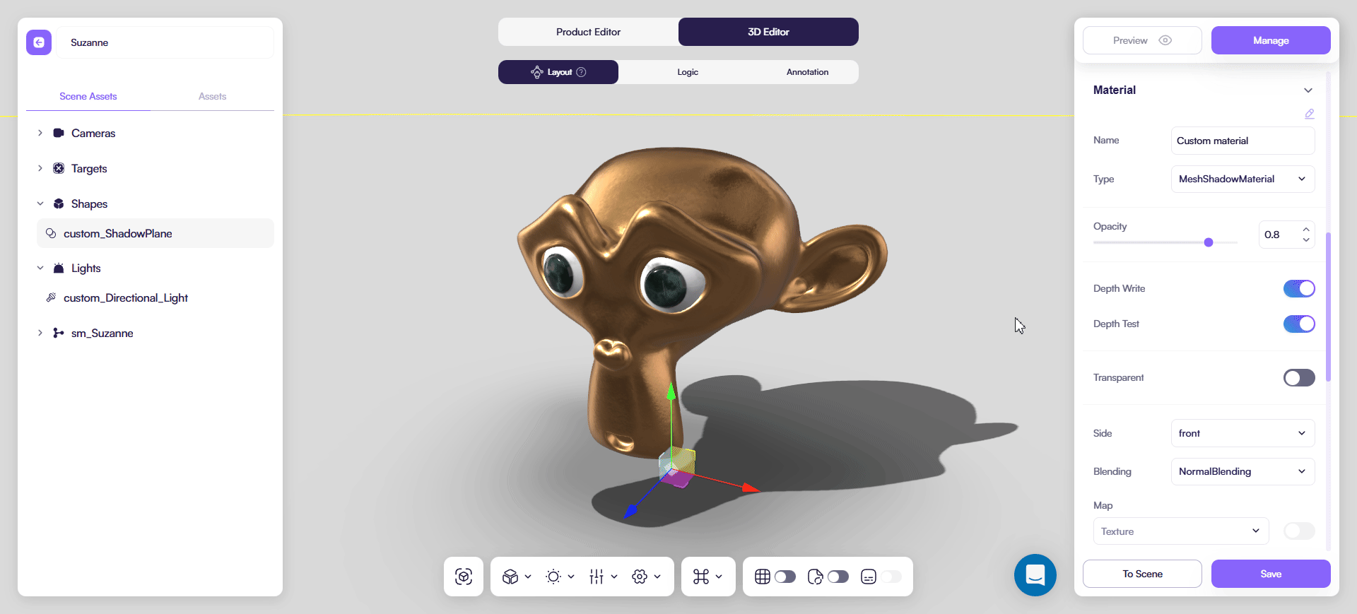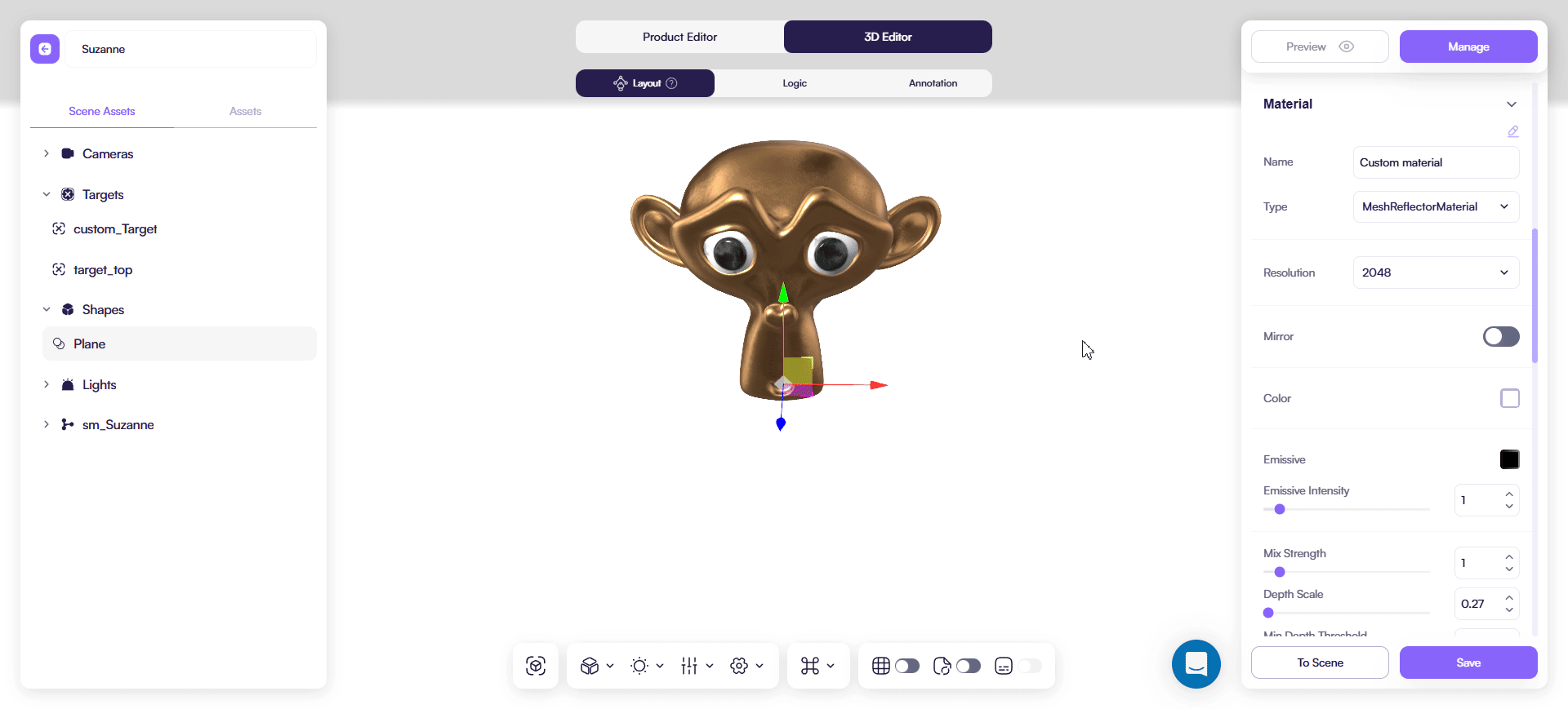 If you open the full Material Editor (via Assets or Edit), it opens in a new browser tab. Scene edits saved with Save also update the same material and appear in the Material Editor.