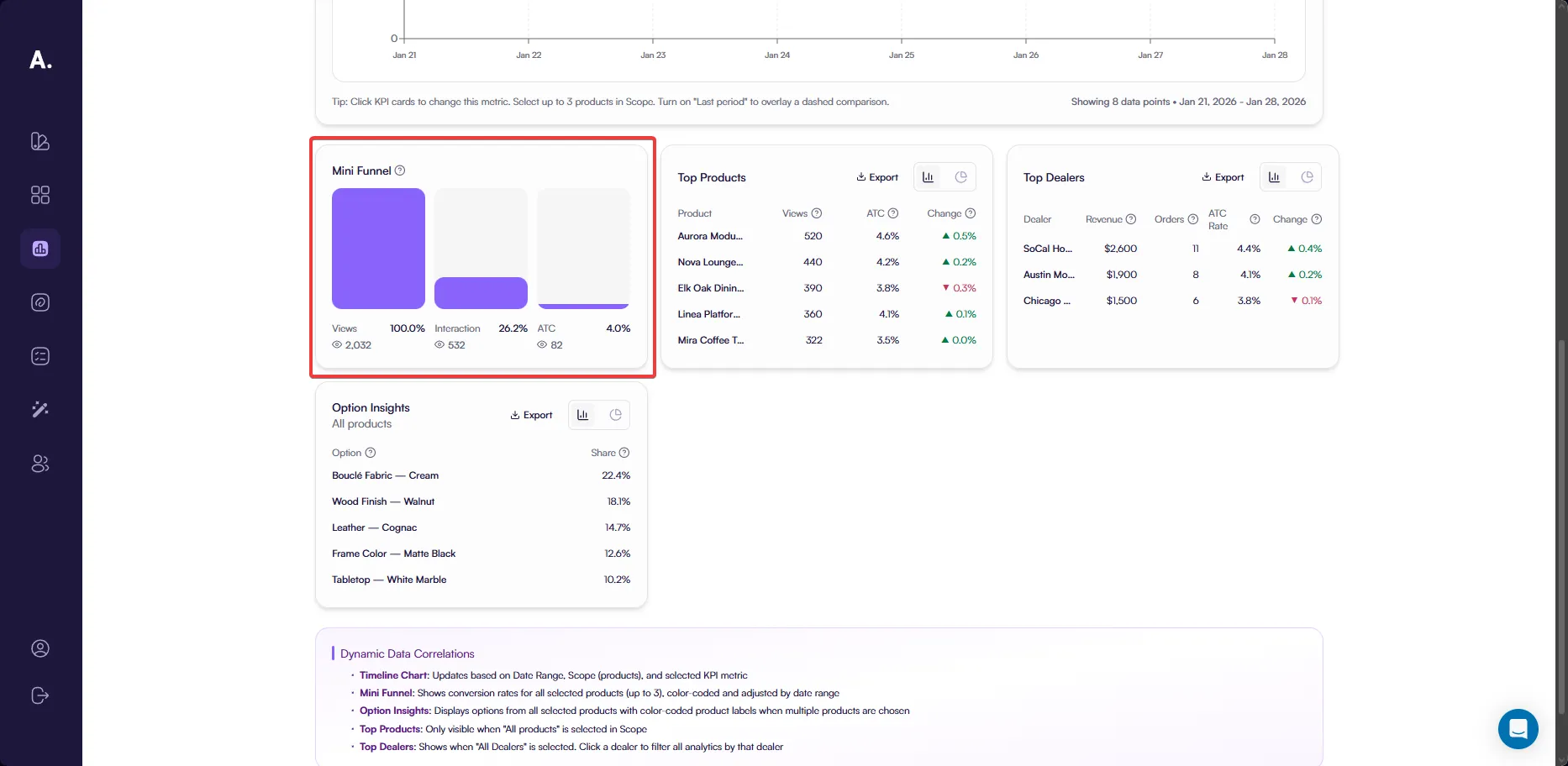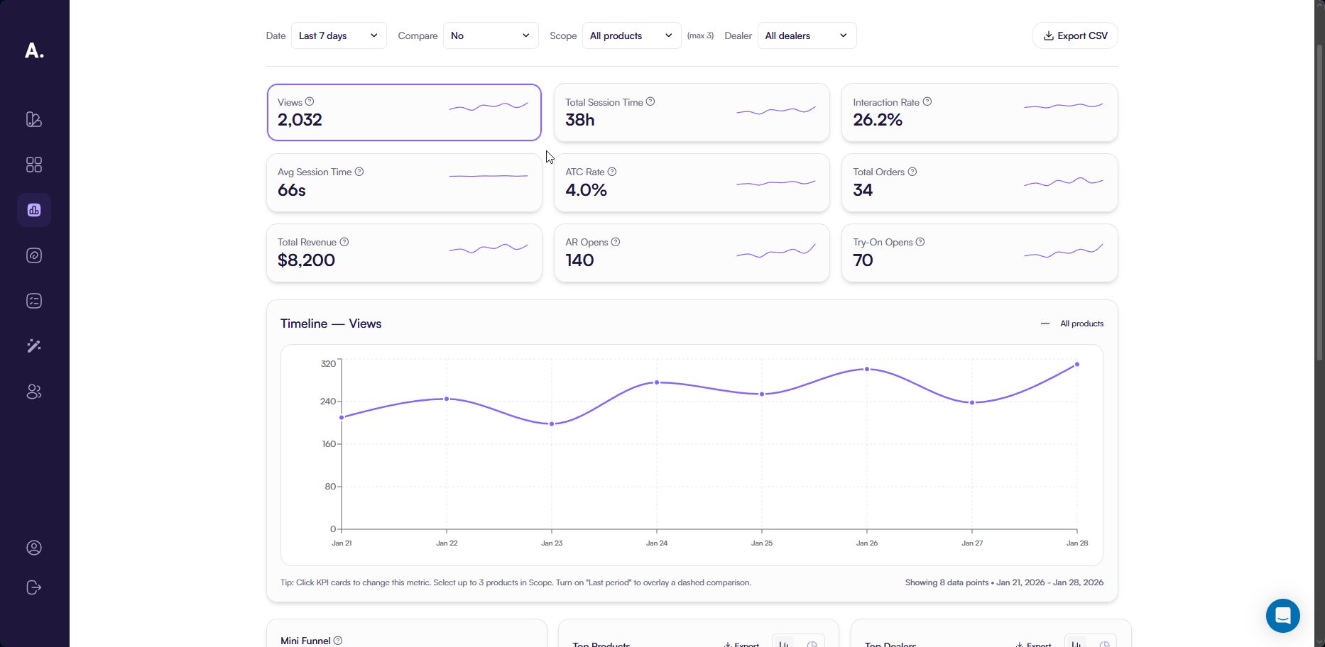 The Mini Funnel helps you understand how product views translate into engagement and add-to-cart actions.