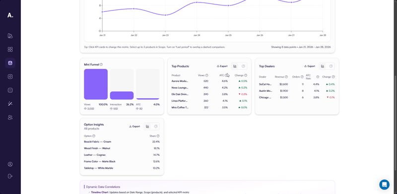 All metrics update in real time based on active filters, allowing you to analyze performance by product, period, and dealer. This helps you understand what drives engagement, identify drop-off points, and optimize product configurations for better conversion.