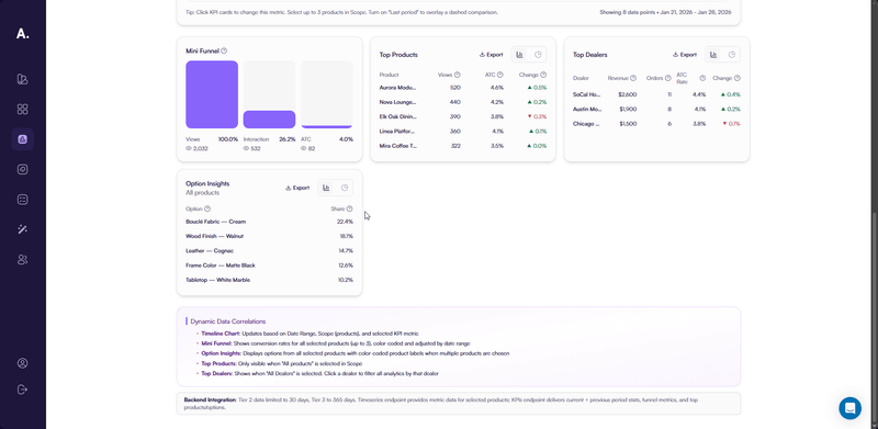 You learn how to read KPI metrics, analyze trends over time, compare periods, and identify top-performing products, options, and dealers. This gives you a clear picture of what drives engagement and conversions, and where to optimize the product experience.