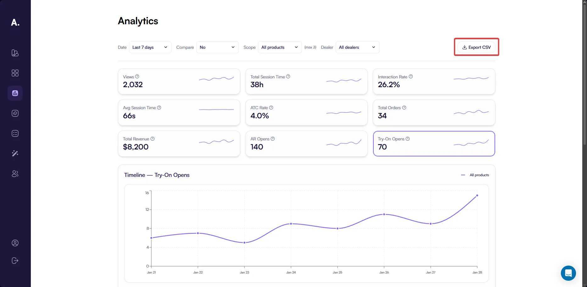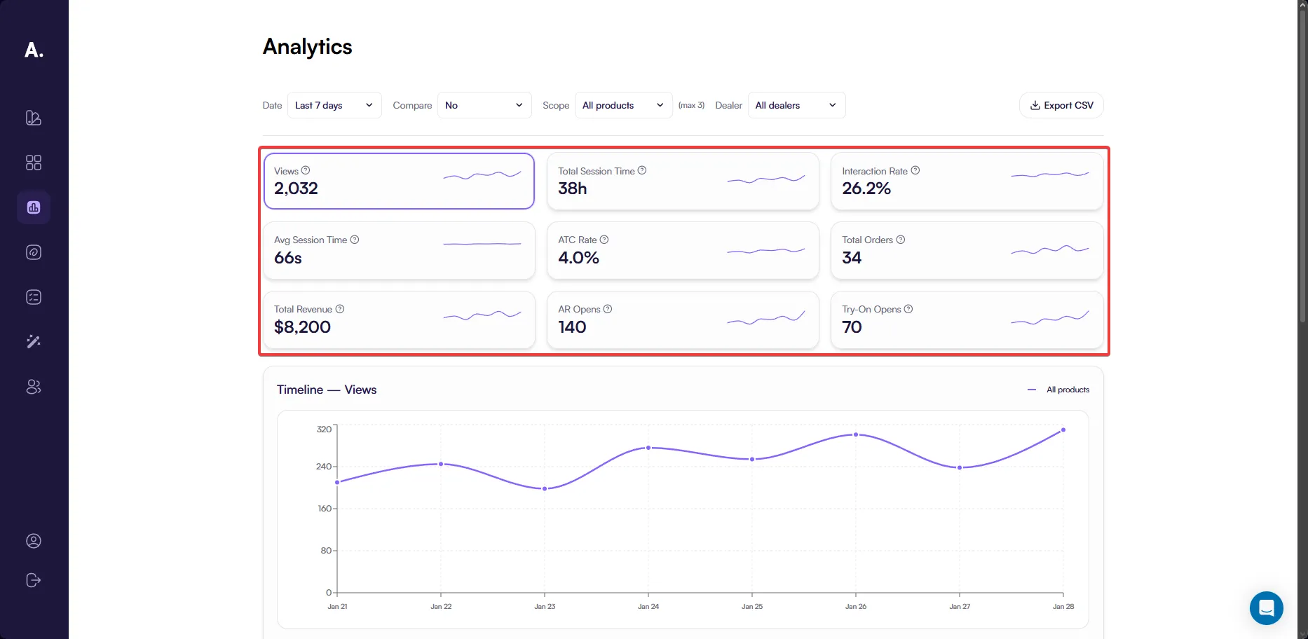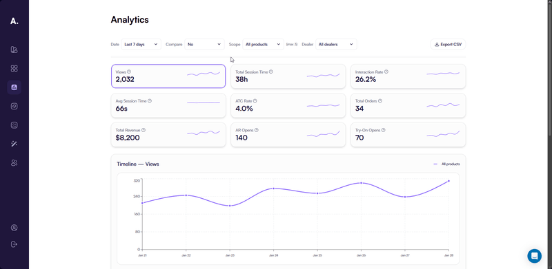 - Interaction — sessions where users interacted with 3D or AR features after viewing the product